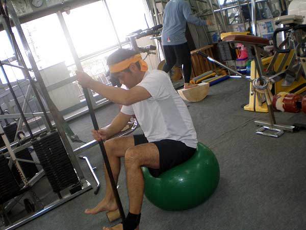 05.こちらでは、バランスボールと棒を使ったトレーニングです。