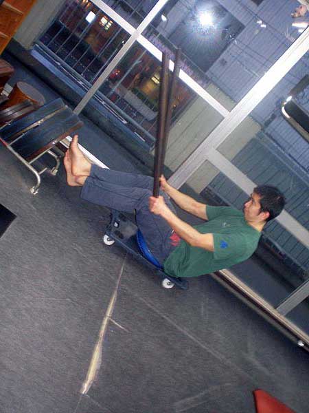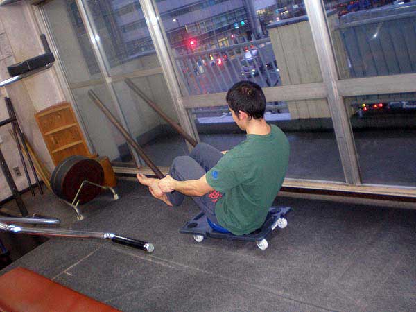 03.キャスターに乗り、お尻の下にはバランスディスクが敷いてあります。